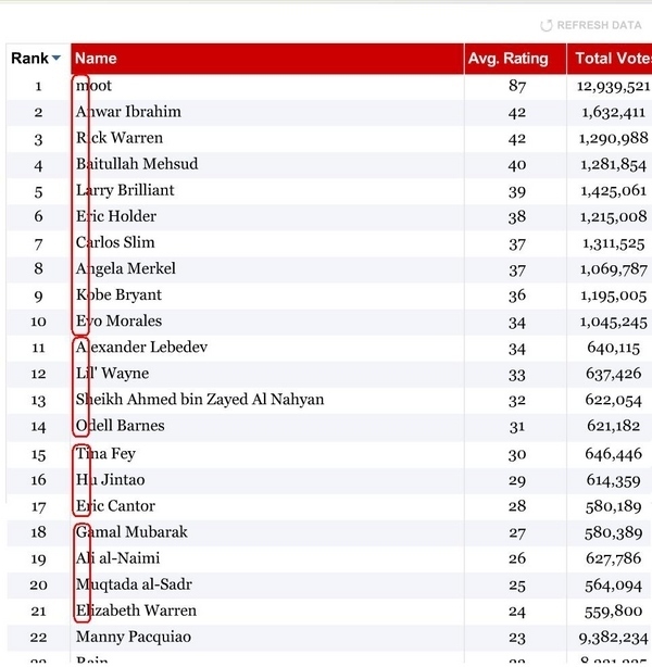 Except Time.com’s technical team didn’t do a very good job, because the top 21 names still spell out the Marblecake sentence. Time knows it was pwned by 4Chan, but simply throws up its hands. Time.com’s managing editor Josh Tyrangiel tries to defuse criticism by admitting that the poll is meaningless. He says, “I would remind anyone who doubts the results that this is an Internet poll. Doubting the results is kind of the point.” Or maybe the point is to name an Internet celebrity and create a controversy so that people click through to read the results. Well played.