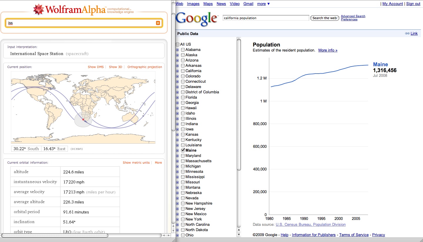 Not long after that, we received the screenshot above from an anonymous “benefactor” of Wolfram Alpha asking “which one is computing about the future?” The Wolfram screenshot shows a search for “ISS” and the results show the flight path and current position of the International Space Station, along with its altitude, velocity, inclination, orbit type, and other useful stats. Google population search, in contrast, plots basically one data point over time (although, you can easily add others). The suggestion is that Google quickly ginned up its public data search feature to undermine Wolfram’s debut. And it worked. Nobody really paid attention to the two hour snorecast (except Larry Dignan at Cnet—thank you Larry for sitting through it so the rest of us didn’t have to).