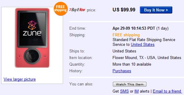 Want a Zune? Actually, do you want a cheap media player ’cause they don’t get much less expensive than this. Sure, this model is the last generation, but you still get all the goodies of the new models. The player is available via eBay through the Best Buy Outlet so you can purchase with confidence. Oh, and the shipping is free.