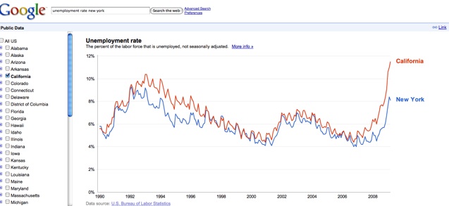 Google is getting fancy with public data in search results. If you search for “unemployment rate New York” or for any other state or county in the U.S., the first result will be the latest data from the U.S. Bureau of Labor Statistics along with a chart. If you click on the link or image it will take you to an interactive chart where you can compare the unemployment rate to other states or counties. For instance, here is New York (8.1%) vs. California (11.5%).
