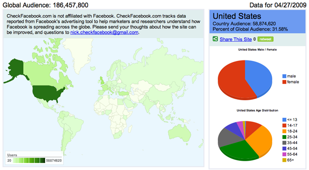We all know that Facebook is growing like a weed, especially internationally, but which countries are really seeing the most growth? TechCrunch alum Nick Gonzalez has put together a new tool called CheckFacebook designed to help users do exactly that. The site is primarily meant for advertisers, who can use it to gauge where to deploy campaigns, but it also offers an interesting look at each nation’s basic demographic information in an easily digestible format. The site pulls from data that Facebook publicly discloses to advertisers, but isn’t normally readily available because it’s tucked away into the ad signup process.