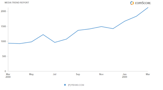 Currently, PBworks manages 50,000 wiki groups, with 10 million pages and 3 million users per month, according to the company. ComScore shows healthy growth and 2.1 million unique visitors worldwide (see chart below).