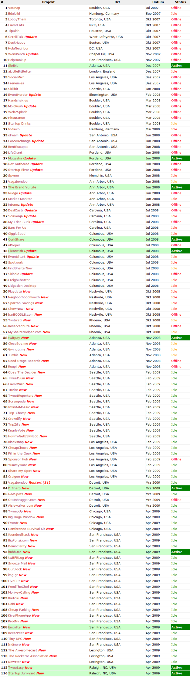 The results so far: only 12 out of the 116 startups (approximately 10 percent) launched after Startup Weekends held from July 2007 to April 2009 can still be considered active, and 35 out of the bunch (approx. 30 percent) are currently offline. Most of the projects carry the ‘idle’ status, which means there have been no visible changes to the service for a certain period of time.