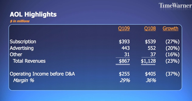 Time Warner announced first quarter earnings today, giving us a peak at how AOL is doing. It’ seen better days. Revenues were down 23 percent to $867 million. Of that advertising revenues made up about half ($443 million), but were down a gut-wrenching 20 percent. Yahoo, in comparison, saw a 12 percent decline in advertising revenues during the quarter, and Google saw 6 percent growth in total revenues on an annual basis. Even Microsoft did better on the online advertising front, suffering a smaller 16 percent drop in the quarter.