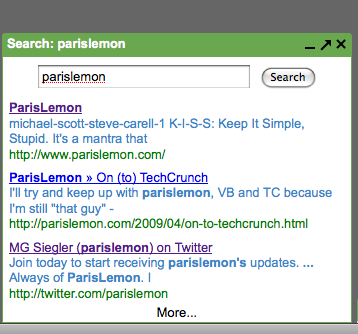 Yes, it may sound lame or obvious, but it’s a pretty kickass feature. Once enabled, it puts a Google Search widget in the left side toolbar of Gmail. From there, you simply input a query into the search box, and it will pop up the results in an overlay window at the bottom — the same type of window it users for IMs and Tasks. It will show you the top three results in this box automatically, or you can click “more” to expand the box. You can also pop the results out into their own window.