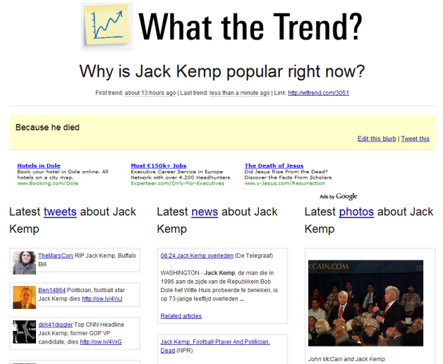 You can directly tweet that there’s a trend explanation to your own Twitter account, with bonus points for another service boasting its very own URL shortening service (wttrend.com). The service has its own Twitter account which it regularly updates with new trends + explanations and also offers RSS feeds and its own API. I’m left wondering which desktop application provider will be the first to integrate the What The Trend explanations, and how quickly people will start abusing the wiki-approach the service is taking: my guess is we won’t have to wait long for either one to happen.