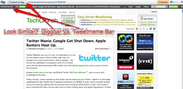 Today, it added OAuth, which lets you sign in with your Twitter account and retweet headlines without leaving the page. It also launched a toolbar, which will be controversial because it opens up the underlying link within a Tweetmeme URL and frame much like the Diggbar does. Instead of showing how many times the story has been Dugg, the frame shows a count of how many times the story has been Tweeted along with a “Shuffle” button (equivalent to the Diggbar’s “Random” button) that will take you to another highly Tweeted story.