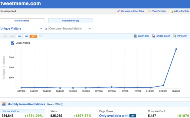 Tweetmeme is on a tear. According to Compete, the Twitter-centric link tracker went from nowhere in February, 2009 (with 26,000 unique visitors) to more than tenfold increase in March (to 385,000 uniques). Nick Halstead, The CEO of UK-based Fav.or.it, the company behind Tweetmeme, tells me he is tracking closer to 200,000 uniques a month based on yesterday’s visitors, but that he is adding 50 percent a week. Tweetmeme seems to be pulling way ahead of the other Twitter link sites such as Twitturly or Twit Links. Any way you slice it, Tweetmeme is doing something right.