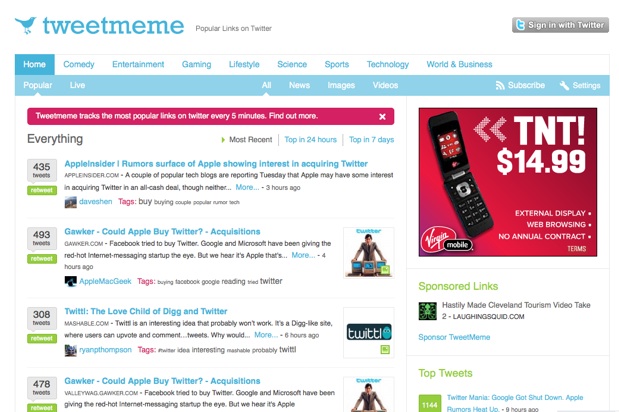 Right now, I’d say the answer is no. Not because Tweetmeme doesn’t surface the most Tweeted stories, but because everyone on Twitter seems to be obsessed with linking to stories about Twitter! For instance, right now 6 of the top ten headlines on Tweetmeme are about Twitter acquisition rumors. To be fair, that was also the top story on Techmeme for most of the day. But at least Techmeme has moved on (to Kindle rumors!). Will the stories on Tweetmeme ever become more relevant and timely than on Techmeme? If I were Gabe Rivera, I’d start worrying now.