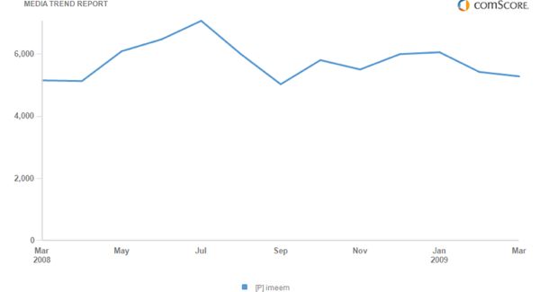 According to comScore, imeem’s U.S. traffic has come down about 25 percent off its peak last July. As of March, 2009 it was at 5.3 million unique visitors in the U.S. and 24 million worldwide. In the perverse world of music streaming licensing, the bigger your audience, the more money you lose.