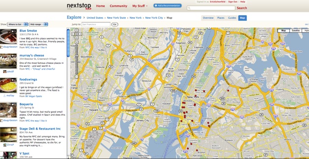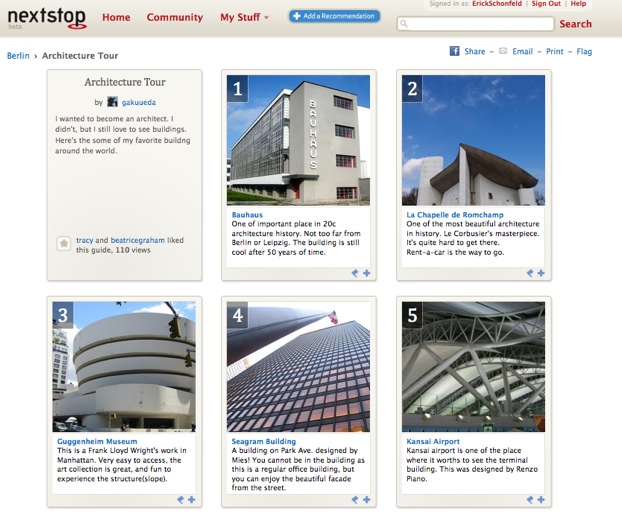 Everything on nextstop is geared towards getting people to recommend their favorite places and organize those recommendations into guides. There are various ways to explore the site, including a search box, by city, a guide view, or a map view (see screen shots below). The recommendations can be collected together into guides (like this one for an architecture tour), which can be explicitly “liked” by members. The guides can be sorted by most recent, most liked, or most viewed. You can save any place or guide in a wishlist for later viewing.
