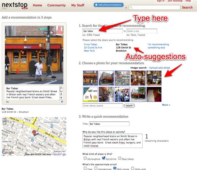 Once you create an account or sign in using Facebook Connect, you can type in the name of practically any bar, restaurant, tourist attraction, or business after clicking “add a recommendation.” It will suggest places it recognizes along with their addresses, and if one of them is what you are trying to recommend, you click on it and nextstop will place it on a Google map and find pictures. You pick an image, add a short Twitter-length recommendation no more than 160 characters, and categorize it as a place to eat/drink, stay/sleep, or do/explore along with an approximate price range (free, inexpensive, mid-range, high-end). Then the recommendation is created and other people can find it on the site. I did this for a restaurant in my neighborhood in Brooklyn, Bar Tabac, and it found it immediately, along with a great picture.