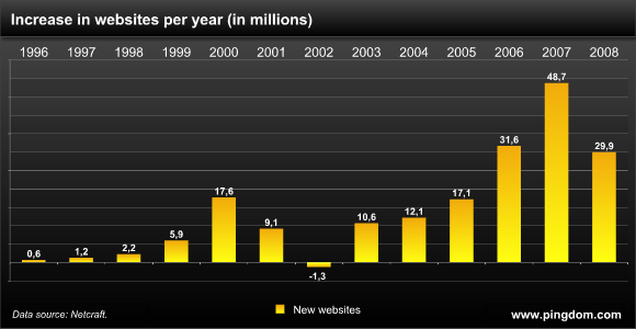 There are now 231.5 million Websites according to Netcraft. But last year the number of new sites added to the Web slowed down to 29.9 million, from 48.7 million in 2007. Royal Pingdom went through Netcraft’s server surveys to come up with the chart above, which shows the increase or decrease in the number of Websites for every year going back to 1996.