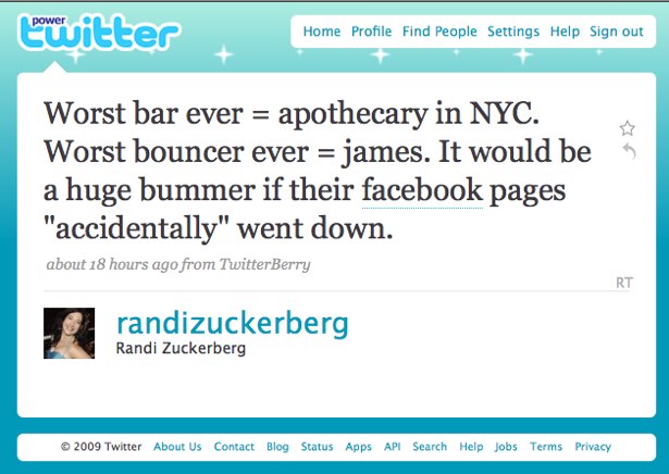 It’s sort of funny when Facebook’s Randi Zuckerberg takes her frustration out on a club bouncer by saying (it has now been removed) it would be “a huge bummer if their facebook pages “accidentally” went down.” But it’s also terrible messaging for the fast growing company. Randi is founder Mark Zuckerberg’s sister, an executive of the company and also their unofficial spokesperson. Her statements carry weight, can be intimidating and considered an abuse of power.