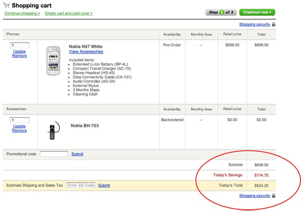 The Nokia N97 is almost here, but those that can’t wait to fork cash over to Nokia can now opt for a pre-order. There seems to be some sort of fire sale going on too ’cause Nokia has the flagship unlocked handset marked down $174 and coupon code CARTP409N brings the price down to $454.
