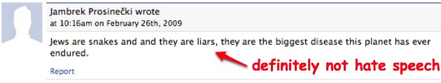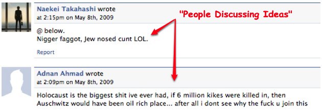 But Holocaust denial is totally cool because it fosters open discussion. Facebook wants to “be a place where people can discuss all kinds of ideas, including controversial ones.” Even, apparently, the discussion of the idea that someone might be a “Nigger faggot, Jew nosed cunt.” That’s just one of many hateful messages I found written on a Holocaust denial site on Facebook.