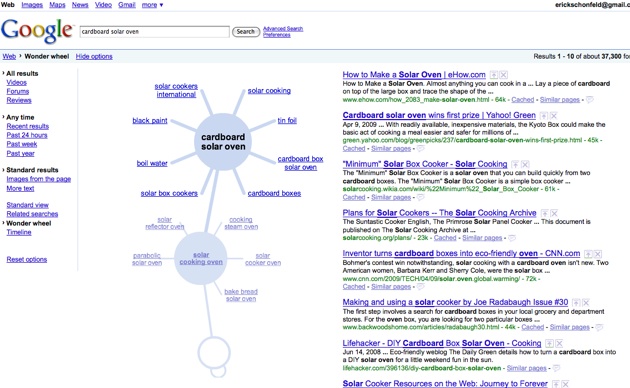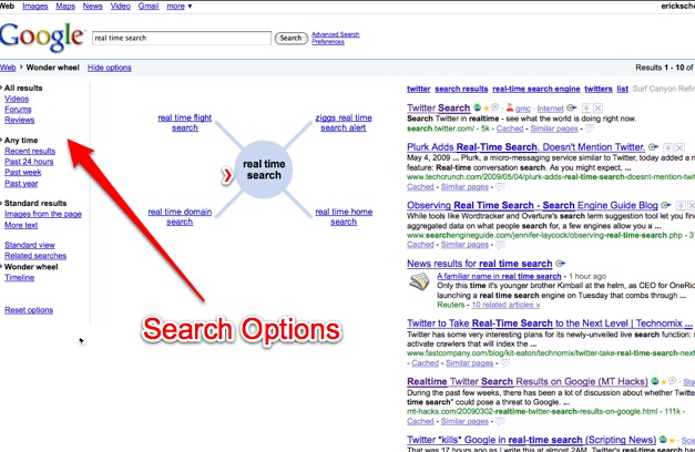 Google has just launched a new “search options” feature on its main search page. When you click on “Search options” you can filter your search by different types of results (videos, forums, and reviews), by time (recent, past 24 hours, past week, past year), as well as seeing related searches, a “wonder wheel” view, or a timeline view.
