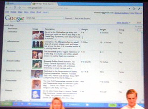 Google Squared is launching later this month in labs. Google Squared returns search results in a spreadsheet format. It structures the unstructured data on web pages. So a search for Small Dogs returns results with names, description, size, weight, origin, etc., in columns and rows.