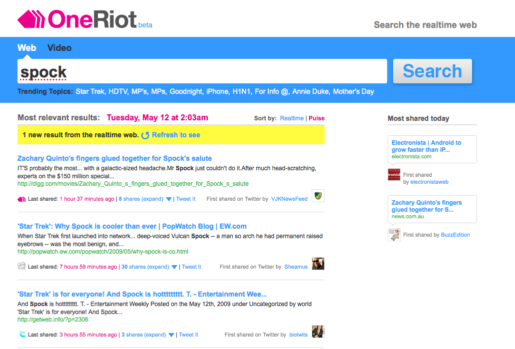 Unlike FriendFeed, which recently implemented its real-time element, OneRiot takes the “queue” approach, where it indicates at the top of the results that there are new results waiting to be viewed. This is the same thing that Facebook and the actual Twitter Search use. Peggs says they built the system both ways to test it, and that users overwhelmingly favored this queue approach. The actual real-time view made some nauseous, he joked.