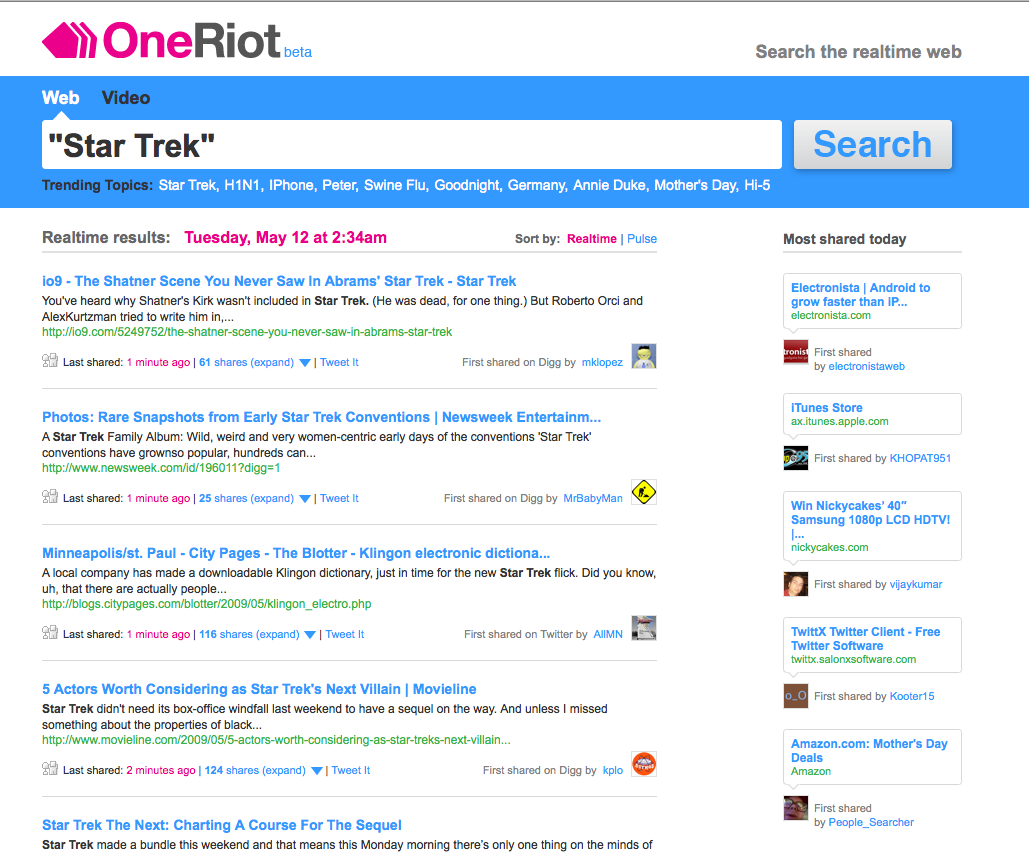 But why is OneRiot better than a service like Scoopler, a service we covered the other day that also does real-time search? Well, OneRiot believes the two are simply different. Scoopler is focusing on conversational search (basically what Twitter Search is now, searching for words in tweets), while OneRiot is about content search (more like Google). Eventually, Twitter wants to evolve into a cross between the two, and some reports indicate that Google is also interested in exploring this intersection. But for now, it would seem that OneRiot will have a bit of a head start in parsing the real-time shared web links.