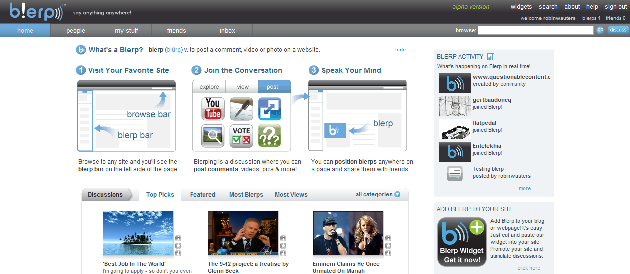 The app basically creates a virtual space on top of websites that you visit in the form of a sidebar and a header, which allows you to post text, photos, videos and interactive elements like polls and ratings on top of the page while still being able to see and interact with it. Blerp users get a personal homepage dubbed My Stuff that gives them an overview of what’s being discussed by their friends online, and are able to jump right into the conversation from the interface. In Digg, or rather StumbleUpon fashion, users can ‘hype’ certain discussions to help it get featured on the Blerp homepage, with the extra ability to favorite (aka bookmark) live discussions and share them with friends by e-mail or through a variety of social networking services.