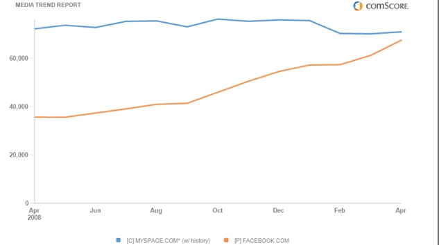 Since the redesign went into effect, Facebook’s growth has accelerated. After flat 0.3 growth in February, Facebook added nearly 4 million unique U.S. visitors in March (up 6.6 percent over February), and another 5 million in April (up 10.3 percent over March) to end at 67.5 million domestic uniques, according to comScore. That puts it within kissing distance of MySpace’s 71 million unique U.S. visitors in April, by the way (see chart below), and keeps a healthy 50-million visitor gap with Twitter, which added 8 million U.S. visitors in April alone.