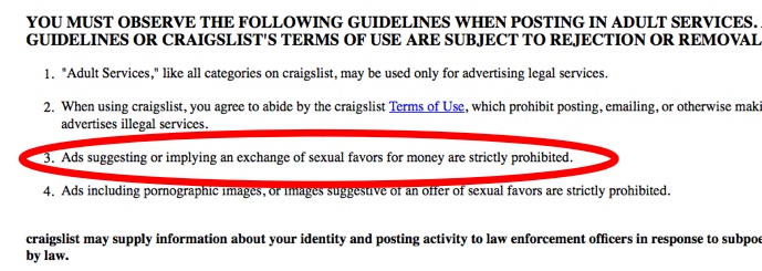 Existing ads in the erotic services category will remain for seven days, but already new ads are not being accepted in that category. People trying to place an ad in the adult category are reminded: “Ads suggesting or implying an exchange of sexual favors for money are strictly prohibited” and “Ads including pornographic images, or images suggestive of an offer of sexual favors are strictly prohibited.”