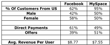 The first stat, which measures the amount of payments to come from the US vs international audiences, isn’t surprising at all. Facebook is seeing huge growth internationally (where MySpace continues to struggle), so far more of Facebook’s transactions come from abroad than they do on MySpace.