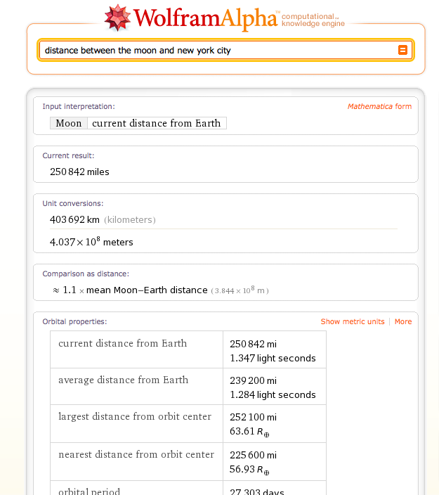 Wolfram Alpha is not a regular search engine. It doesn’t scour the Web for data to return the best results. Rather, it ingests data into its own massive databases so that it can run the information through its own constantly-growing set of algorithms to “compute” the answers. These algorithms are based on computer scientist Stephen Wolfram’s Mathematicasoftware. When it does come up with an answer, it can be brilliant. Scientists, engineers, and math geeks are going to love Wolfram Alpha. It can do calculus, regression analysis, compute orbital paths and fluid dynamics, and call up detailed information about specific genes. But too often it doesn’t have the best answers for basic questions and searches.