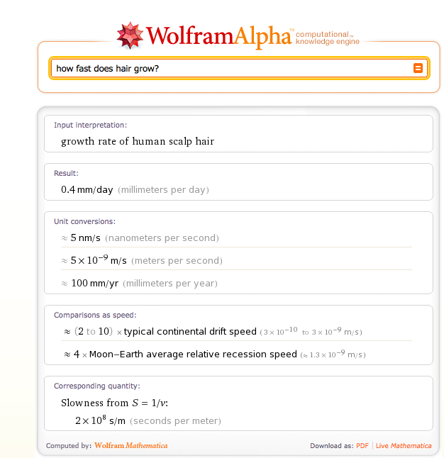 How about when it does have an answer? I asked it “How fast does hair grow?” It came back with “0.4 mm/day.” It also gave me the answer in nanometers per second (5) and millimeters per year (100). It also knows the “distance between the moon and New York City” (250,842 miles right now), as well as the “Answer to Life, the Universe, and everything,” which is “42” (as anyone who has read the Hitchhiker’s Guide to the Galaxy will tell you, as will Google).
