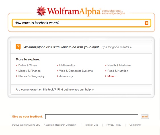 A search for “techcrunch” came up with nothing. Company names work better for publicly traded companies. You get the stock price and financial data when you search for “Google.” A search for Facebook turns up Alexa data about the site such as pageviews and daily visitors (Alexa is not always the most accurate source for this sort of Web data, however). When I asked, “How much is Facebook worth?” it was comically flummoxed, responding: “Wolfram Alpha isn’t sure what to do with your input.” To be fair, nobody (person or computer) in the world knows the answer to that question.