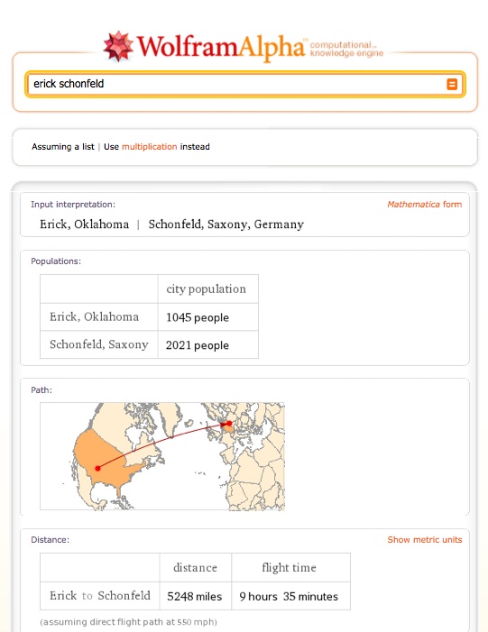 For instance, it doesn’t do so well with searches for people who are not famous. I tried a vanity search of my name, for instance, and it came back with the distance between Erick, Oklahoma and the town of Schonfeld in Saxony, Germany (5,248 miles).