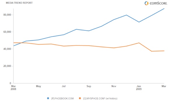 Worldwide monthly page views for MySpace have declined from 47.4 billion a year ago to 38 billion today, a 20% drop. In that same period Facebook has grown from 44 billion to 87 billion, a roughly 100% increase. And it isn’t much better when you look at just the U.S. data. They’ve seen a 16% year over year drop in page views, from 41.6 billion to 34.8 billion (Comscore, April March 2009). Facebook has grown from 13 billion to 20 billion page views per month in that period.