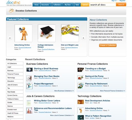 Popular document sharing service DocStoc just launched a collections feature, which lets users package documents around a particular topic. DocStoc has already created close to 50 collections, including “Starting a Small Business,” “Advertising Online,” and “Traveling on a Budget,” and is opening up the platform to users to add to existing collections and create their own.