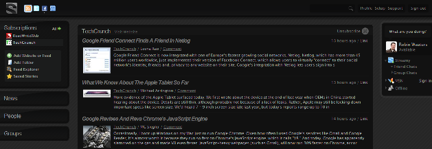 Streamy is really fast, which is a big part of why I like it so much. Skimming RSS feeds is a joy to do, the recommended stories were spot on, and the ability to create groups and folders is a big plus. To share stories with your friends or save them for later you can simply drag the headline of an article to the side a bit, which will pop up a menu that lets you perform a couple of actions in a very intuitive way. You can also share stories with your friends over IM by simply dragging the headline to your contacts in the sidebar.
