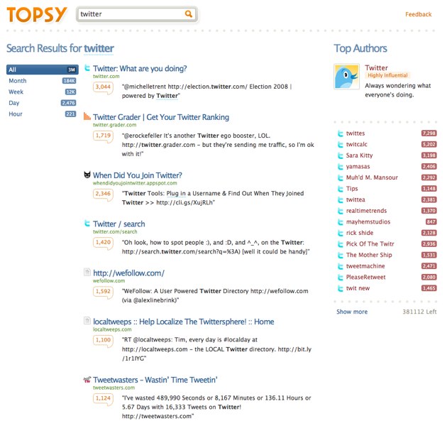 Some of those users have more influence than others. And some links are sent by lots of Twitter users, others just sent once. Those links, combined with the information in the Twitter message itself, is what Topsy uses as the basis of its search engine.