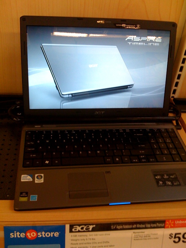 Even though we haven’t heard a thing about the Acer Aspire Timeline since it was announced a while ago, that doesn’t mean we have forgotten about Acer’s latest ultraportable notebook. The $598, 15.4-inch model (5810TZ-4657) was spotted at a Wal-Mart of all places by one of our intrepid readers minutes ago. Didn’t know that Walley World stocked the latest and greatest, eh?