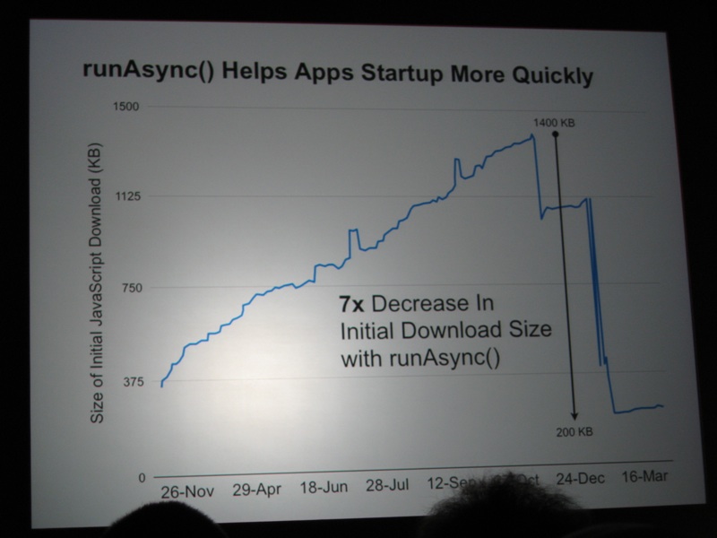 - Next version of Google Web Toolkit — manual code splitting JavaScript is hard, but now we’ll do it for you with runAsync. Download code after the initial download. Code downloads in background after user up and running.