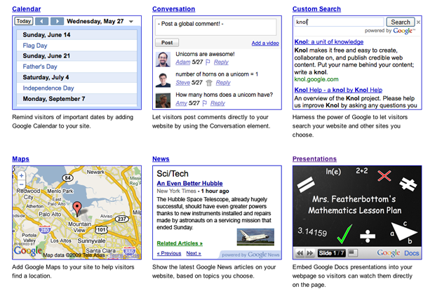 During today’s Google I/O keynote, the company unveiled a new set of widgets collectively called Web Elements that are sure to spread across the web like wildfire. The widgets allow users to quickly integrate some of Google’s most popular products, including Calendar, Search, and Maps, directly into their sites with a minimal amount of effort. Much of the same functionality has previously been available through Google APIs (in fact, some of these widgets were built on them), but most bloggers haven’t known how to use them before now. Google Web Elements makes the process much easier – just copy and paste an embed code, and you’re done.