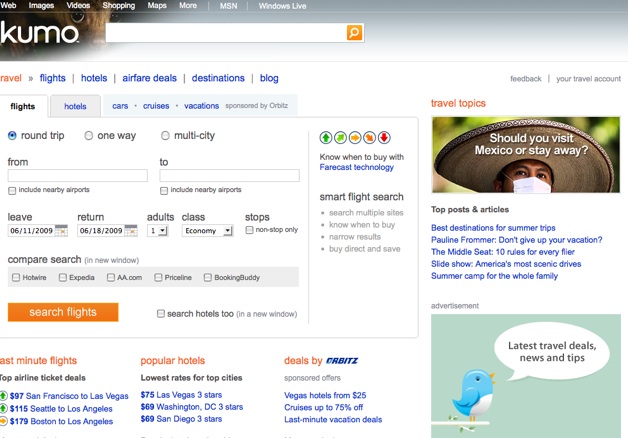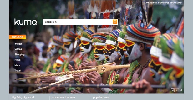 The internal codename for Bing is Kumo (which is what you see in the screenshots), and the current release is called Kiev. Rather than a spare, blank screen, Bing’s homepage surrounds the search box with a single beautiful image, such as the one of the tribesmen above or a kinkajou. You can hover over parts of the image to get factoids about the image or click through to an image search result page to explore more. The left-hand pane offers the option to narrow your search on images, videos, shopping, news, maps, or travel. Each of these has a different look and feel. A travel search will turn up a page based on Microsoft’s Farecast technology asking you where you want to go, with flights, hotels, and destination information. A news search offers up headlines, photos, videos, and local news in a column on the right. A shopping search will bring up products and is tied into Microsoft’s Cashback program.