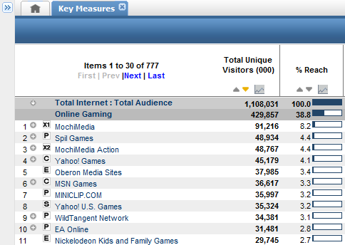 Looking at worldwide traffic, comScore pegs the Mochi Media network to have received a little over 91 million unique visitors last April, or roughly 8.2 per cent of the total traffic measured in the ‘Online Gaming’ category for that month. These are impressive numbers: the second ranked online gaming destination is Spil Games, and the total amount of traffic that network receives on a global scale per month is close to that of Mochi Media Action, a subset of Mochi’s network made up of only one genre (adventure games). Familiar brands you’d expect to rank higher, such as Yahoo! Games, MSN Games, EA Online and Nickelodeon, all obtain less than half Mochi Media’s reach worldwide.
