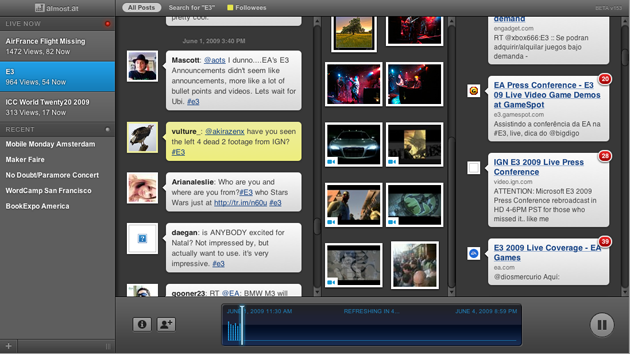 Built on the Cappuccino web framework, the first thing that you’ll notice is that Almost.at is sporting a very polished interface that strongly resembles a native application. The app consists of four main columns. On the far left side you’ll see a handful of different popular topics, which include breaking news stories and events. Clicking on one of these (we’ll use E3 as an example) will fill the three right columns with real-time feeds of recent content: one column for recent tweets that include the #E3 hashtag, another for rich media from Flickr, Twitpic and YouTube, and a third with relevant links that have been sent out in recent tweets.