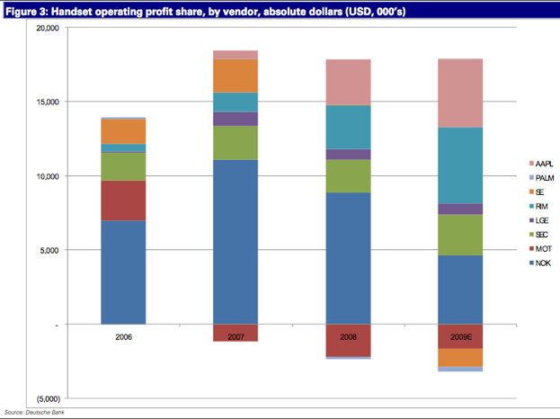 Meanwhile, once-dominant Nokia is seeing its estimated share of industry profits drop from 64 percent (2007) to 57 percent (2008) to 32 percent (2009). The only other major manufacturer to grow its profit share is Samsung, from 14 prcent last year to an estimated 19 percent this year. (A note on methodology: These numbers take into account operating losses at companies such as Motorola and Palm, and the total adds up to 100 only when you subtract their losses, which are expressed as negative percentages).