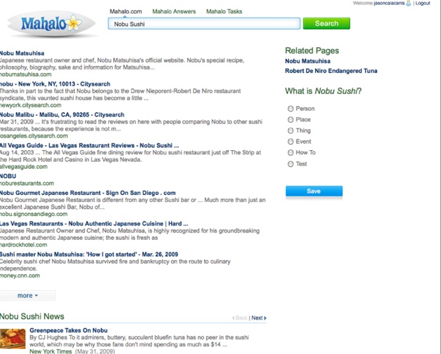 Whether or not these will produce the best pages on any given topic remains to be seen. One problem I see is that claiming a topic and the associated revenues will be on a first-come, first serve basis. If someone comes along later with better domain expertise on, say, sushi (see screenshot below), he or she is out of luck. So there will be a bit of a land grab. With that, there is certainly a danger that people will shift from making spam pages to Mahalo pages. Calacanis dismisses this possibility. He notes that spammers will always be able to make more money on their own and that there are too many tripwires in Mahalo’s system to make it worth their while. Plus, Mahalo will yank any pages it deems too spammy.