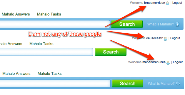 First, I attempted to create a new user name for myself. I decided to go with MrCody, which is the name of my dog. Things seemed normal at first, until I noticed that my username at the top of the screen was now ‘mahendranunna’. A refresh later and Mahalo said “Welcome cddesai”. Being the inquisitive reporter that I am, I attempted to navigate through the user’s control panel. I could view the pages that they were currently managing. I tried to ask a question on Mahalo Answers under one of these accounts, and it seemed to work (the site is currently down so I can’t check to see if it actually posted). Over the course of the next twenty minutes, I was logged in as at least 8 different users. I’m not entirely sure what I was doing to jump between identities — sometimes a refresh would do it, other times I’d have the same username for a few minutes. It was bizarre.