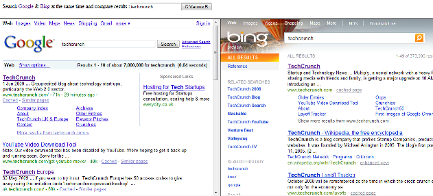 That was fast. Irish programmer and SEO specialist Paul Savage has made this very basic web service, which lists all results for search queries on Google and Bing side by side so you can compare which one produces the best results for the keywords you enter on one single page. We’ve played around with it a bit and found that the tool proves that the user experience for both search engines really is very different: