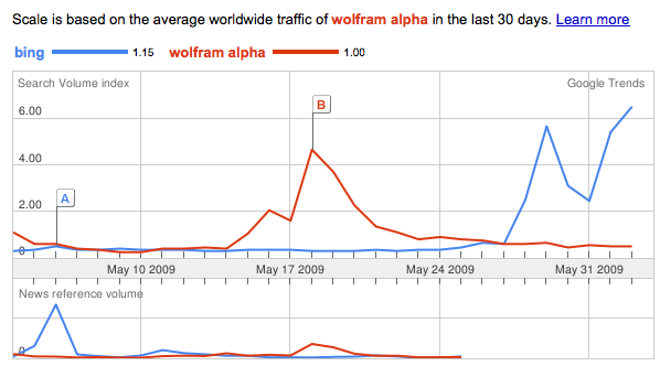 In the past month, we’ve seen some new search engine launches. Two in particular were able to generate a hype cycle of early positive reviews and excitement: Bing and Wolfram Alpha. One was launched by Microsoft, and the other by a startup. It is inherently not a fair comparison because Microsoft has so much more money to spend on marketing ($80 to $100 million is earmarked for Bing)> But most of the buzz so far has been generated by the respective launches with all of the blog and news coverage that entails.