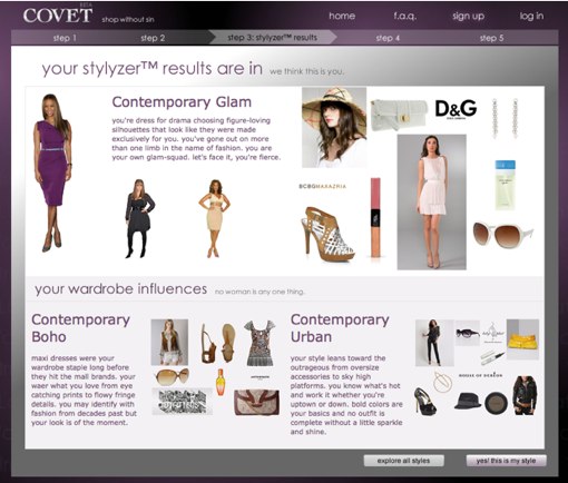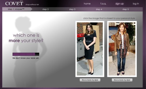 The folks who brought us Riya and visual shopping search engine Like.com have launched Covet.com, a site that acts as a free virtual personal shopper and pseudo stylist for users. Covet will first determine your style based on your responses to a series of photos and outfits worn by celebrities. I found myself choosing between a Chanel-clad Anna Wintour or a leggings-clad Lindsay Lohan. Covet also determines your clothing preference by letting users choose between images that could represent varying types of style (the Eiffel Tower vs. the Golden Gate Bridge, Beer vs. Champagne).