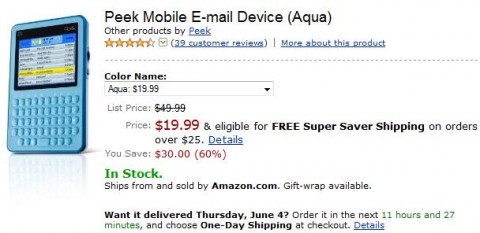 The Peek, everyone’s favorite tiny email device, now costs $20 for the Aqua edition. Note that the Peek requires a $19.95 a month service plan for unlimited email, but with a price this low you’re almost getting the device for free.