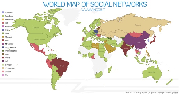 Using Alexa and Google Trend data, Cosenza color-coded the map based on which social network is the most popular in each country. All of the light green countries belong to Facebook. But there are still pockets of resistance in Russia (where V Kontakte rules), China (QQ), Brazil and India (Orkut), Central America, Peru, Mongolia, and Thailand (hi5), South Korea (Cyworld), Japan (Mixi), the Middle East (Maktoob), and the Philippines (Friendster).